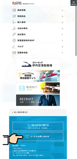 お問い合わせをいただける場合は、画面上部の「MENU」ボタンをタップ