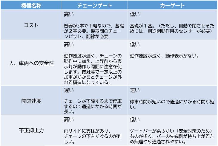 導入時に、よく比較される機器のチェーンゲートとの比較を下記にまとめました。